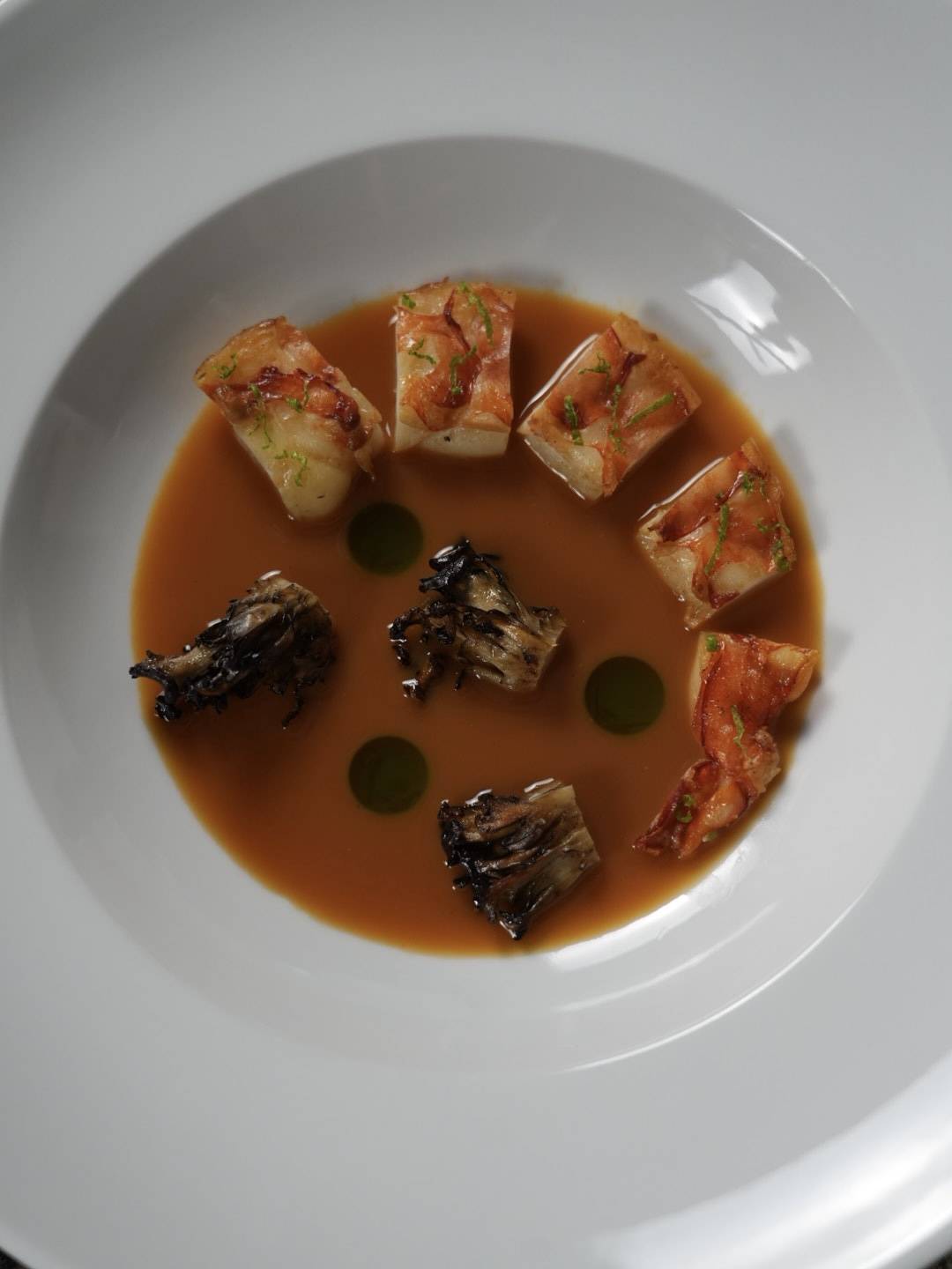 This dish is a practical showcase of that synergy. The prawn shells provide inosinate, while the tomato broth supplies the glutamate. For final plating I serve it with maitake mushroom which contain low-moderate guanylate levels.
